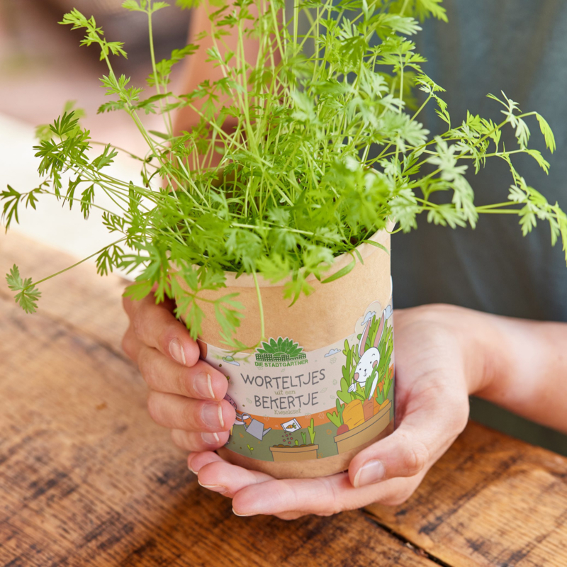 Biologisch afbreekbaar kweekpotje met kokosquelltabletje en hoogwaardige zaden voor biologische snackworteltjes.